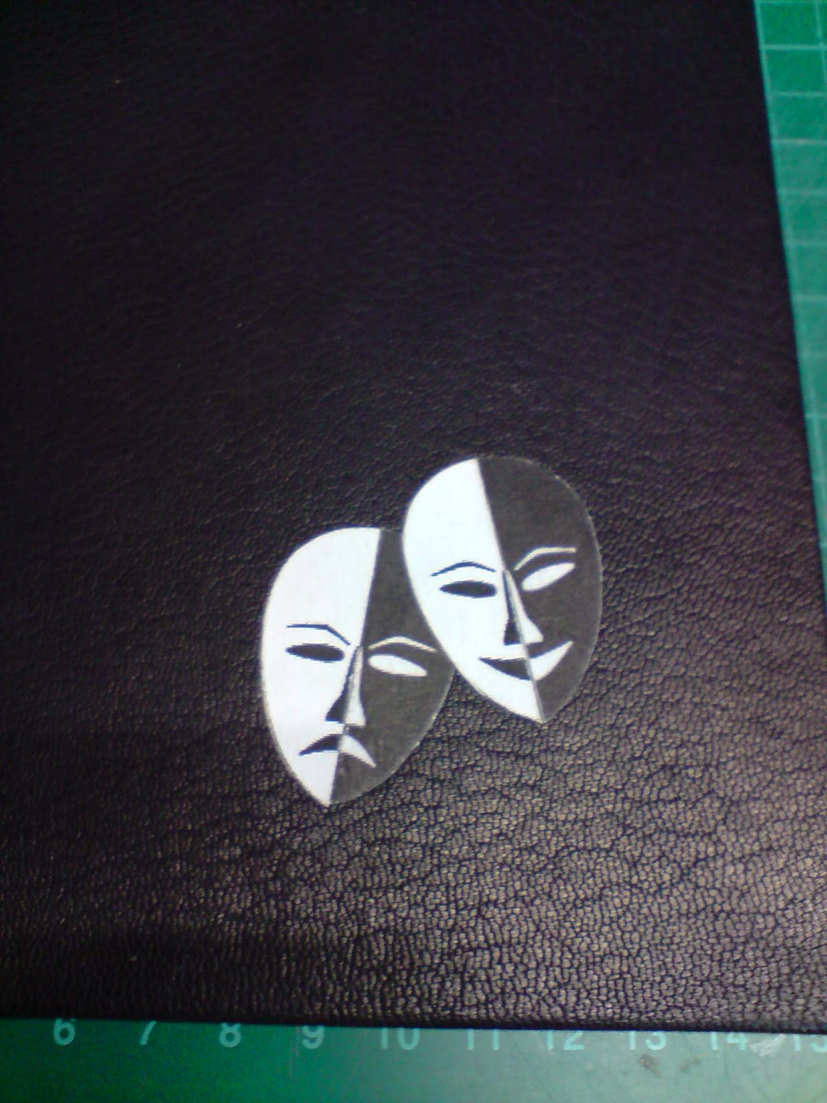 Dicho y hecho. El resultado es una encuadernación en piel chagrén negra, falso encartonado y cabezadas en dos colores (amarillo y verde) a juego con el mosaico superpuesto de la portada: típicas máscaras de teátro, simbolos del drama y la comedia. Finalmente camisa y estuche, a juego, ribeteado también en piel negra.